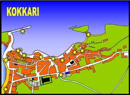 De rondweg over het eiland loopt met een boog om het dorp heen, maar de regionale bus rijdt via de dorpsstraat. De eerste halte -vanuit Samos- is bij de grote Agios Nikólaoskerk. Het zijstraatje tegenover de toegangspoort van de kerk leidt naar de ‘Platía’, het kleine dorpsplein, met daarachter de ‘Paralía’, de kustpromenade. Ook hier bevinden zich diverse gezellige restaurants, cafés en leuke winkeltjes. Dit is het levendige centrum van Kokkári. De smalle straatjes met opvallend kleine huizen geven een extra accent aan de oorspronkelijke romantische vissersdorpssfeer.